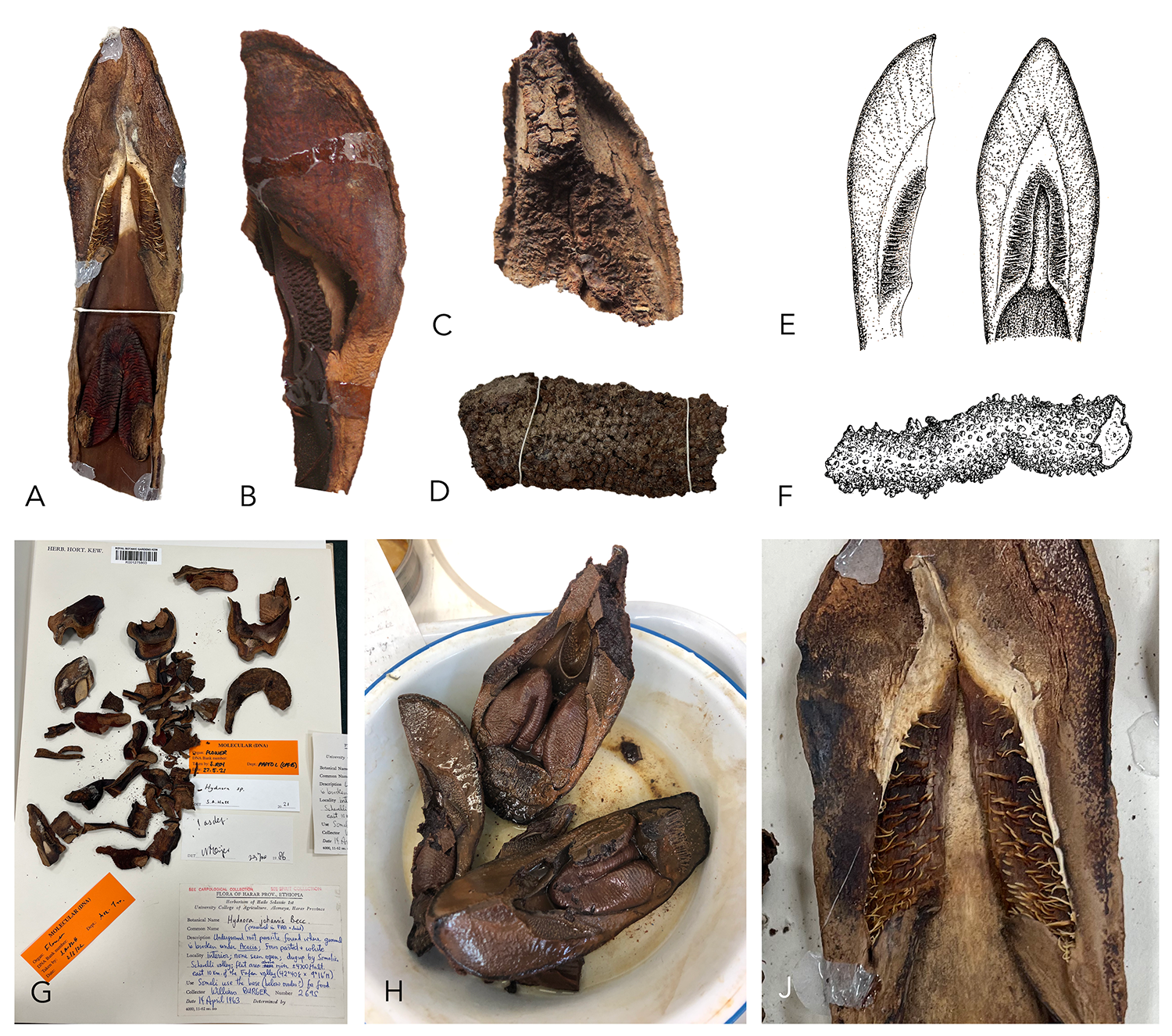 One of the new species described in our recent work is Hydnora bolinii (Fig. 5). It was identified as a new species while we were analysing plant specimens collected from Ethiopia and Somalia labelled as Hydnora abyssinica (a widespread species native to much of East Africa). Three of these specimens were found to be very distinct from all the others, with consistent differences in the shape and structure of the fleshy ‘petals’. Indeed, these specimens did not match the original description of Hydnora abyssinica. Following this revelation, we grouped these three anomalous specimens together and named them Hydnora bolinii (named in honour of Jay Bolin, world expert in Hydnora). To our knowledge, there are no known photographs of this plant alive. The small number of specimens collected may suggest it is relatively rare, although they were collected over a sizable area. Further fieldwork and collecting efforts in Ethiopia and Somalia will be required to uncover more information on this intriguing new species.